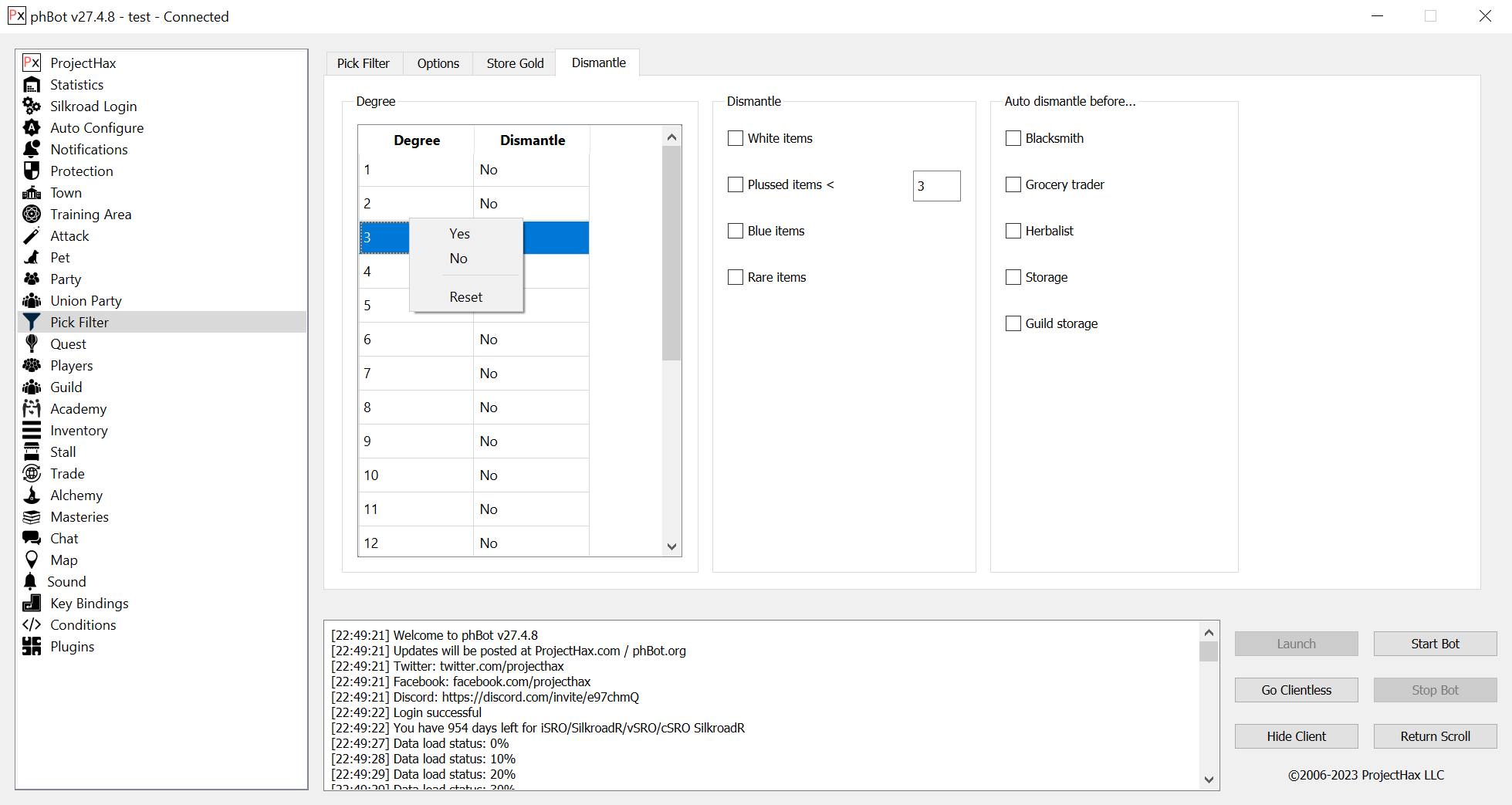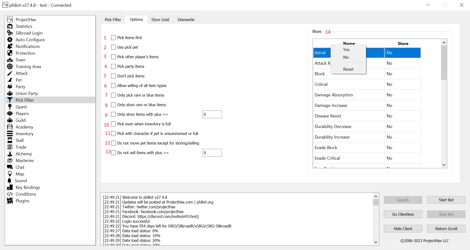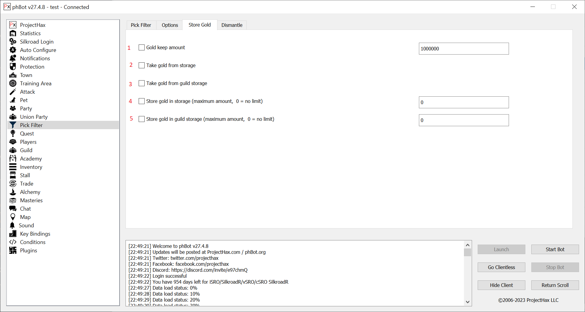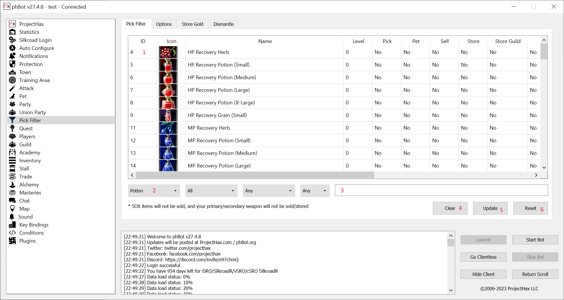 The "Pick Filter" tab or "item filter" allows you to pick, sell, store, store guild all items in the game. It can be configured to use the character to pick items or the pick pet if you have one.