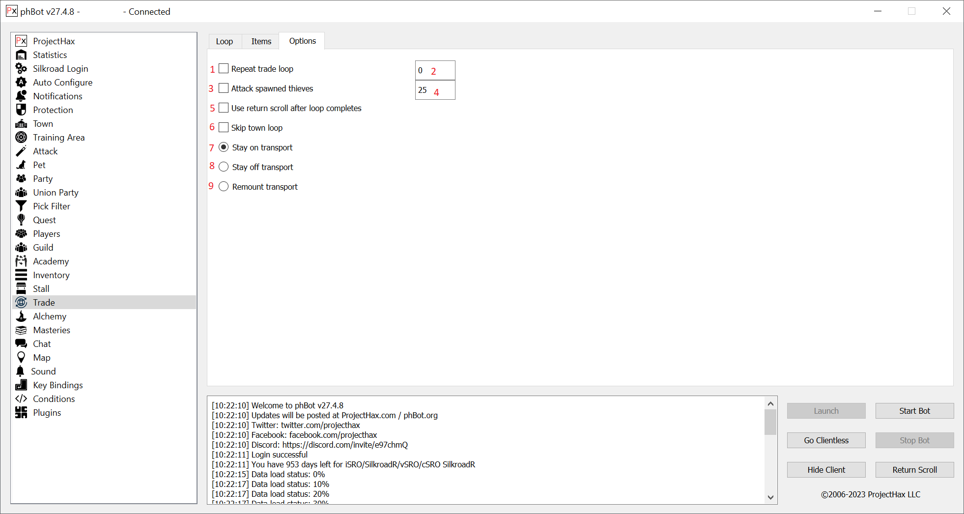 The "Trade" tab allows you to configure the trade loop and have the bot automatically walk to different towns to earn gold..